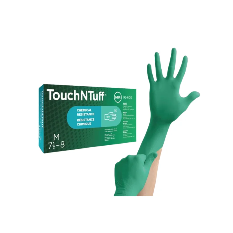 GUANTE NITRILO TOUCHNTUFF 92-600, son verdes turquesa de nitrilo, desechables y líderes en el mundo, contra salpicaduras de productos químicos.
